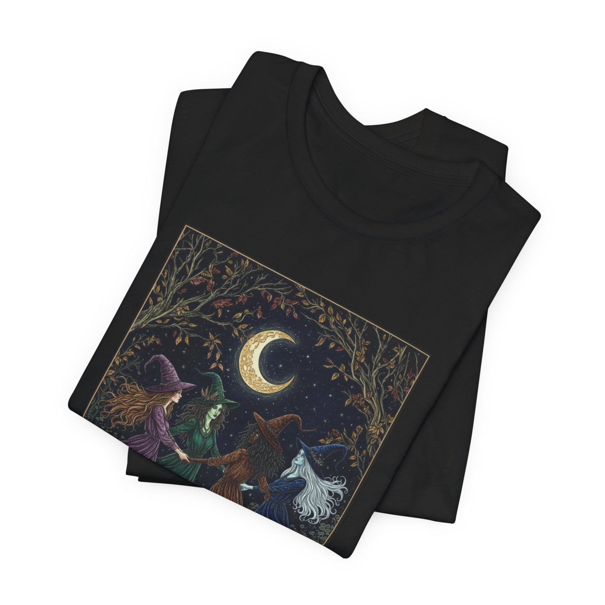 Printed on a premium, dark-toned t-shirt, the rich colors of the witches' dresses and the whimsical forest background pop with magical intensity. It is the perfect statement piece for those who embrace the whimsigoth aesthetic, modern witchcraft, and the beauty of a moonlit coven.