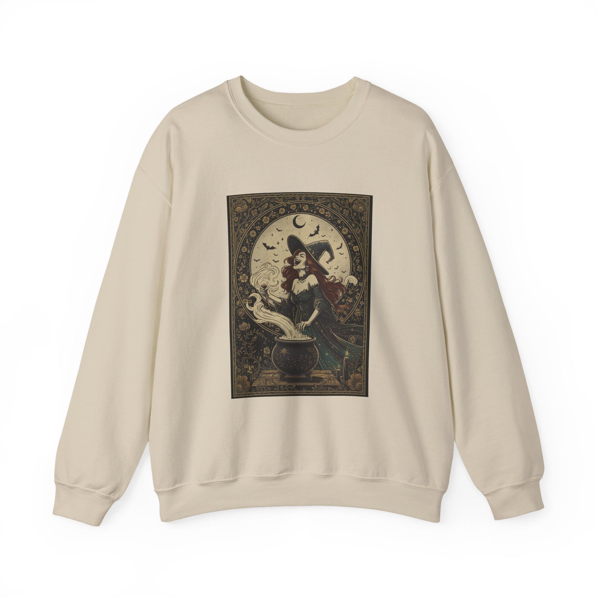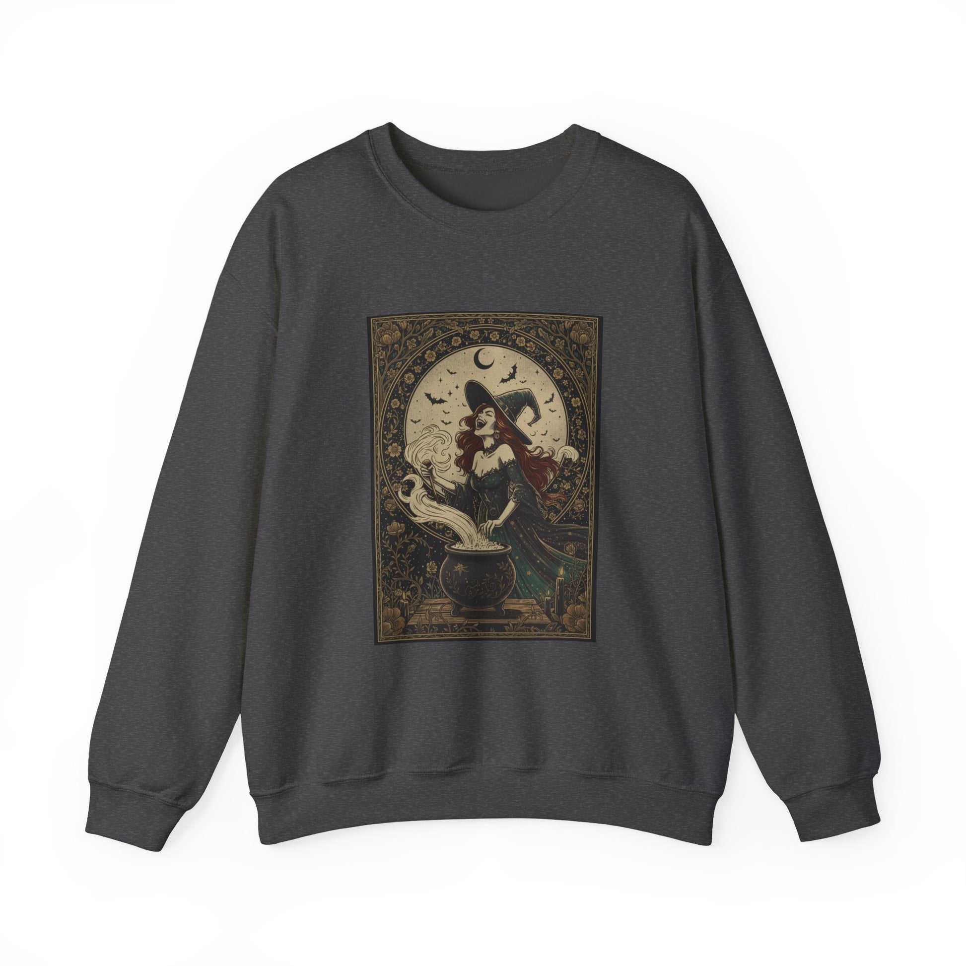 A cozy crewneck that wears like a whispered spell. Soft, medium-weight fabric holds an ornate, vintage-inspired witch motif — a moonlit scene of a witch stirring a cauldron framed by filigree — so the artwork reads like a page torn from an old grimoire. The cut is roomy without feeling bulky, with durable double-needle stitching at stress points and a ribbed collar that keeps its shape. Subtle details (tear-away label, ethical US-grown cotton blend, OEKO-TEX dyes) make this sweatshirt comfortable to live in and easy to care for. It settles into cool evenings, late-night library runs, and slow, candlelit rituals with equal ease.