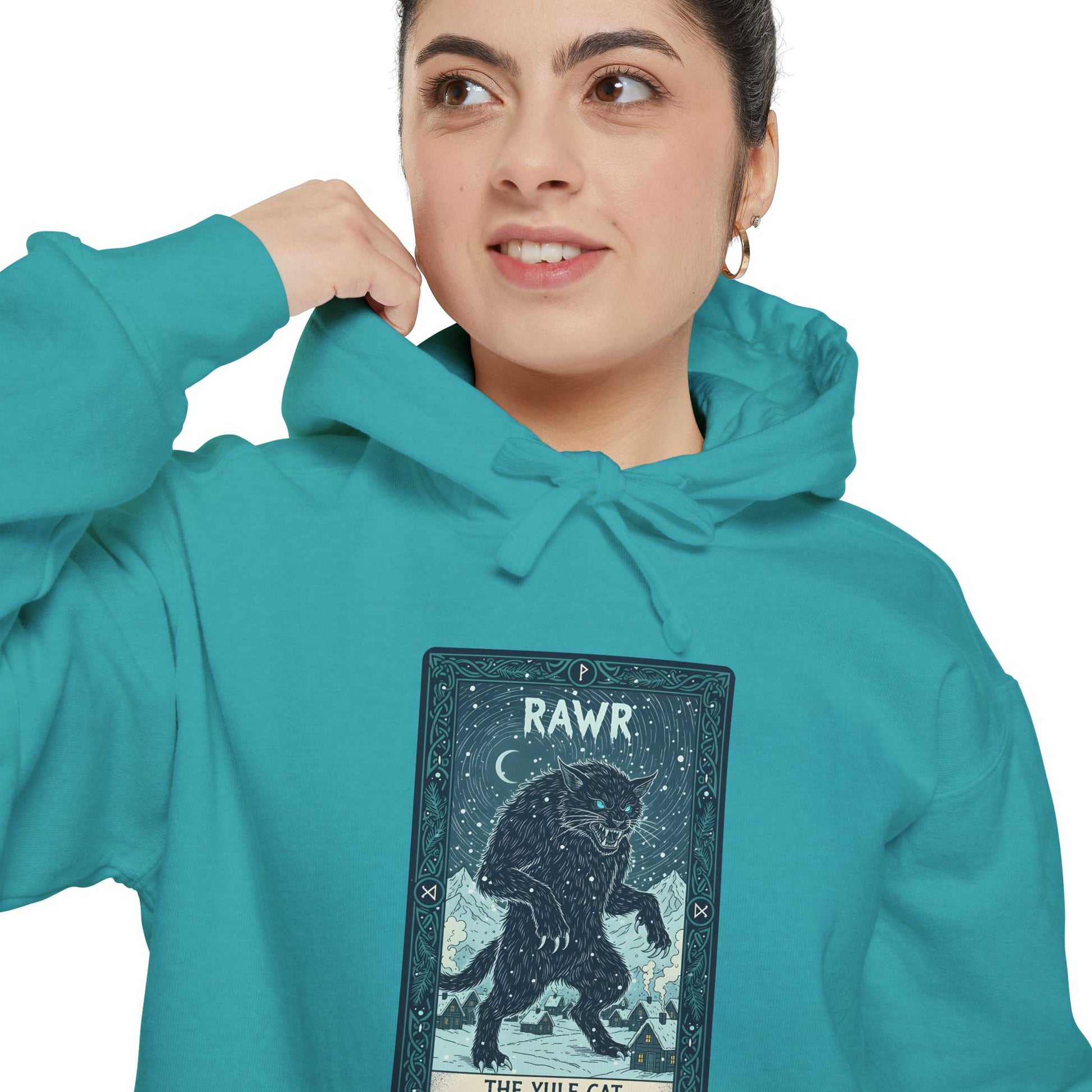 Inspired by the chilling Icelandic legend of the Jólakötturinn (The Yule Cat), this hoodie features the giant, sharp-toothed feline that stalks the snowy countryside during the midwinter season. According to myth, those who do not receive new clothes before Christmas Eve are at risk of being hunted by this monstrous beast.